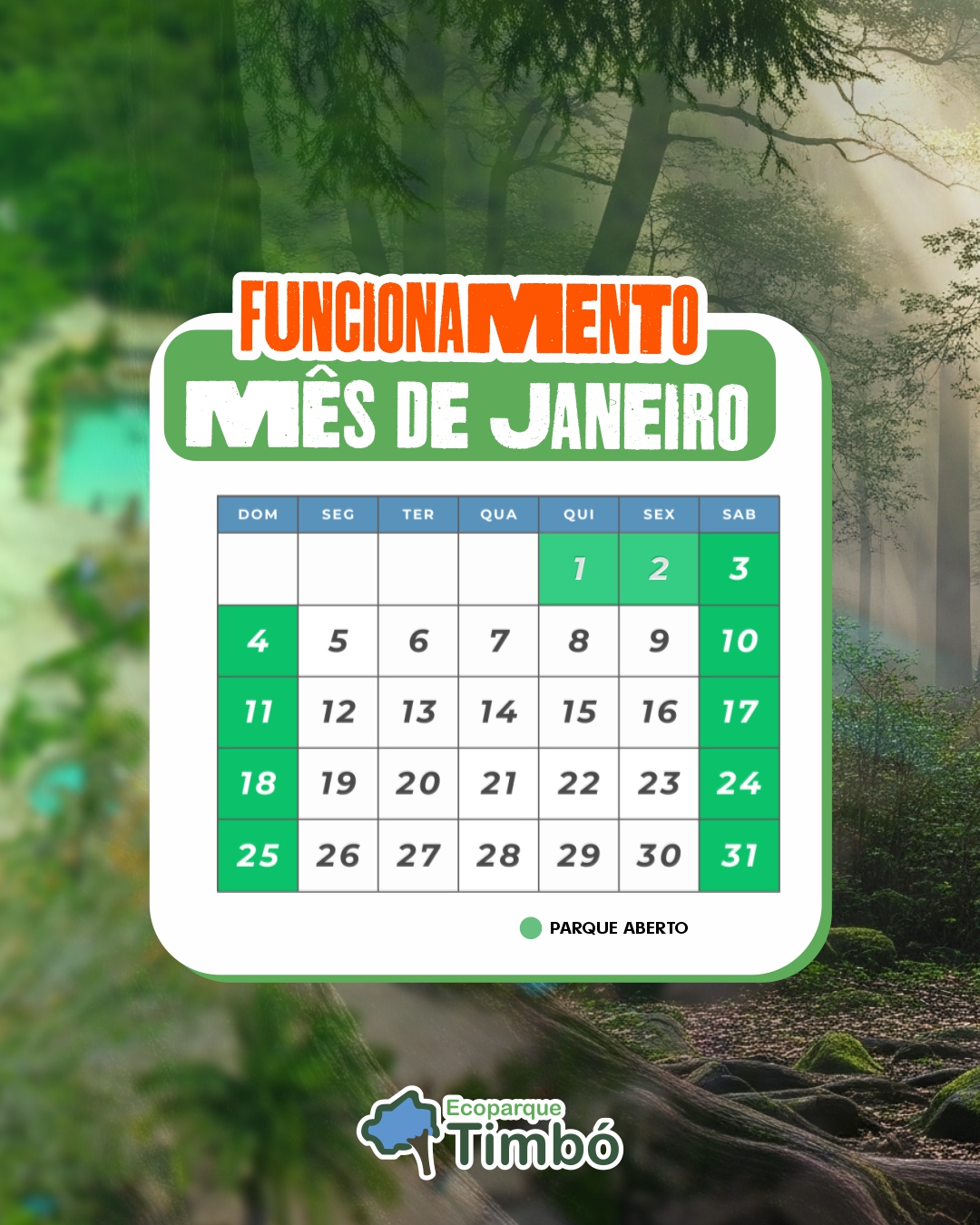 O calendário de Janeiro está especial para você aproveitar. Venha curtir o Ecoparque Timbó com a família e amigos! ☀️🌳 ➡️ Confira na arte os dias de funcionamento e combine com a turma!