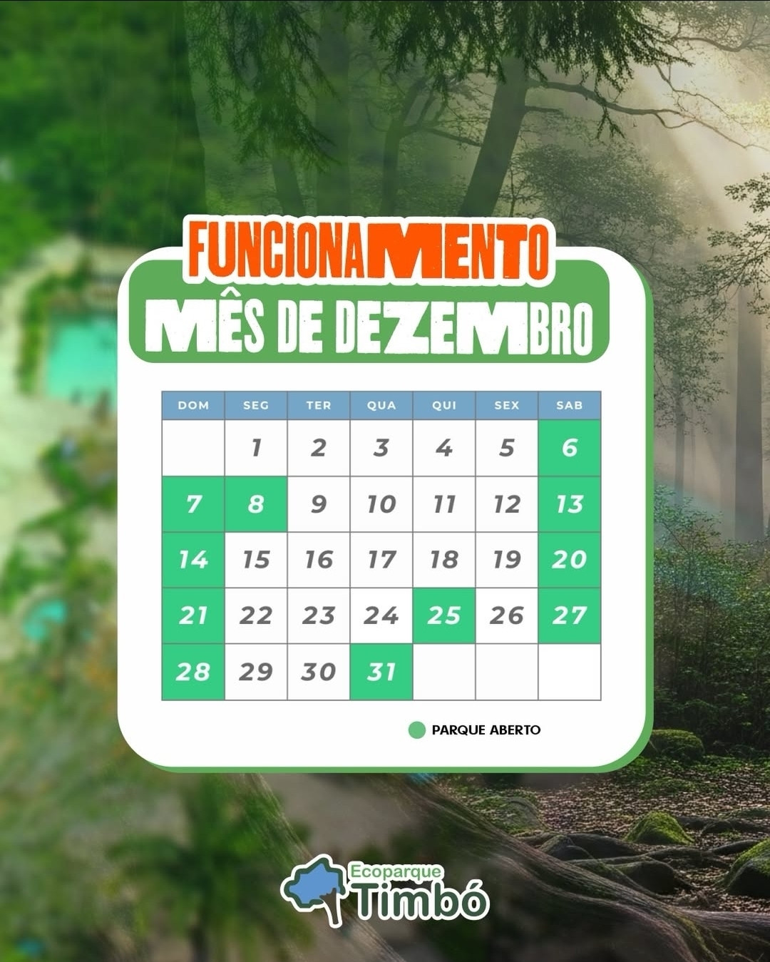 🌲✨ Dezembro chegou com feriado prolongado! O calendário está especial para você aproveitar. Venha curtir o Ecoparque Timbó com a família e amigos! ☀️🌳 ➡️ Confira na arte os dias de funcionamento e combine com a turma!